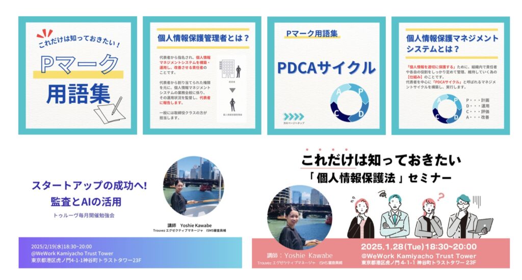 プライバシーマークや監査の用語集や取得に向けたポイント、定期的なセミナー情報等を配信しています。